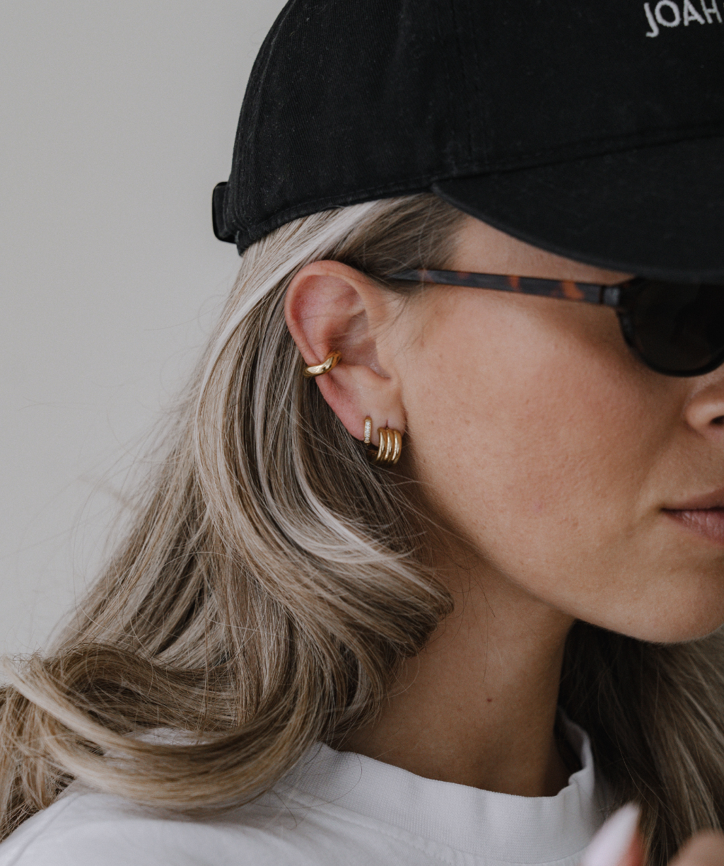 Our Pave Hoops are made of 18k gold- plated stainless steel. The earrings are small hoops with zirconia stones. They are available in 3 sizes, great for wearing in a stack.